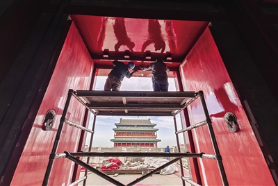 10月14日,正阳门箭楼,工人在按照古法修缮大门。