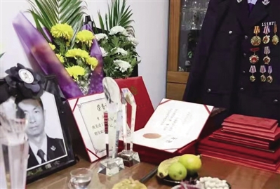 李涌遗像前摆放他曾获得的荣誉证书。图/“山东公安”官方微信公众号