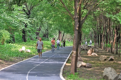 8月20日,北京,市民在一处公园绿道散步、骑行。资料图片/IC photo