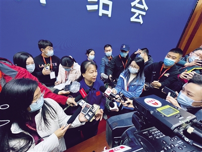 10月14日,神舟十三号载人飞行任务新闻发布会在酒泉卫星发射中心召开。 新华社发(郭中正 摄)
