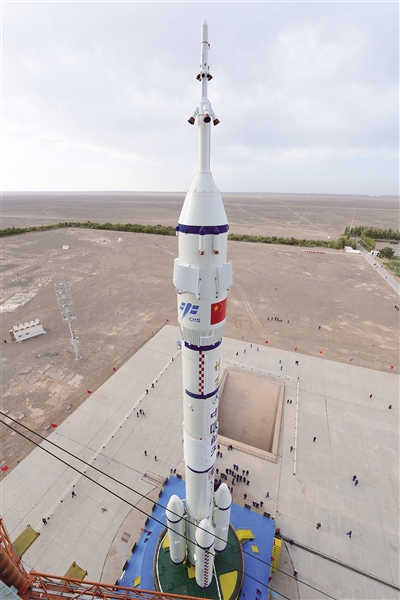 10月7日,神舟十三号载人飞船与长征二号F遥十三运载火箭组合体已转运至发射区。新京报记者 陶冉 通讯员 汪江波 摄