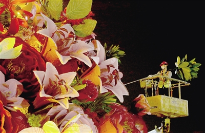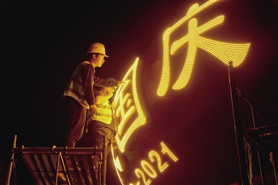 园林工人正在检查“祝福祖国”花篮的照明。通讯员 何建勇 摄
