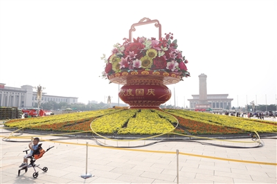 昨日,天安门广场,游客在“祝福祖国”花篮前拍照留念。新京报记者 王嘉宁 摄