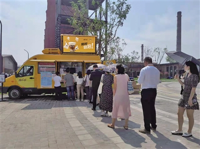 鲜艳的黄色车身,与工业遗存、自然风貌的首钢园区结合得恰到好处,很多观众在购买咖啡后还不忘与咖啡车合影。