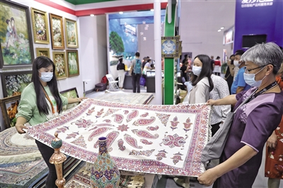昨日,服贸会国家会议中心伊朗展区,市民正在挑选桌垫。新京报记者 王飞 摄
