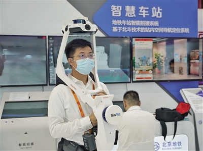 在展区内,还有一套充满科技感的设备同样吸引了大家的关注。工作人员将它套在身上后,按照指定的程序进行操作就能将环境信息采集下来,转化为数字信息。这个就是基于北斗技术的站内空间导航定位系统,通过它可以采集并绘制地铁车站的三维数字地图。