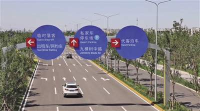 8月27日,北京环球度假区,停车场周边道路设有交通指示牌。新京报记者 郭延冰 摄