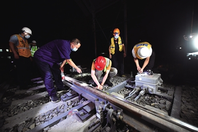 8月28日晚11点20分开始,四惠东站轨道线上,施工人员调整轨道信号设备。