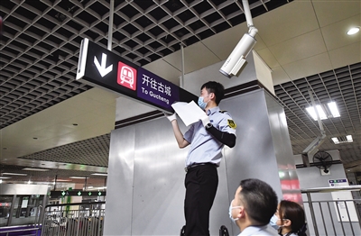 8月28日,四惠东站工作人员正在更新指示标牌。