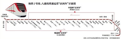 为进一步提高运输效率,满足乘客出行需求,地铁公司新编制了1号线八通线跨线运行图,在工作日早晚高峰期间实施大小交路套跑的运行方式,早高峰小交路为果园站至公主坟站,晚高峰小交路为古城站至果园站。工作日早晚高峰期间果园站、公主坟站以及四惠站将有部分列车为始发空车。