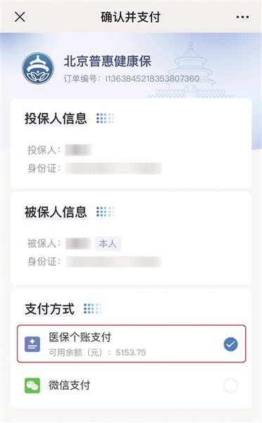 在具体操作流程上,北京医保参保人在线投保后,订单在支付环节,选择“医保个账支付”按钮即可确认支付。