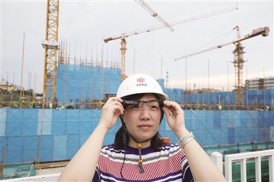 7月8日,光源里棚户区改造项目工地,工作人员戴上AR眼镜。通过AR眼镜和5G网络,再配上工作人员的解说,工地能向居民直播施工情况。