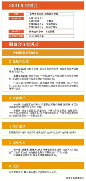 北京市商务局局长闫立刚介绍,本届服贸会把握数字经济、碳达峰碳中和等全球热点趋势,突出服务开放合作促进世界经济复苏,围绕“数字开启未来,服务促进发展”主题,将举办全球服务贸易峰会、论坛和会议、展览展示、推介洽谈、成果发布、边会6类活动。其中,展览展示面积约13万平方米,论坛和会议以及推介洽谈活动100多场。