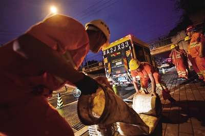 昨日21时,西大望路铁路桥下,为应对强降雨,北京排水集团抢险大队队员安装排水带。本版摄影/新京报记者 李木易