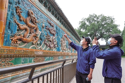 6月16日,北海公园,文物“巡查医”观察九龙壁的健康状况。本版摄影/新京报记者 侯少卿