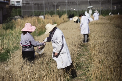 昨日,位于北京北三环联想桥边的中国农业科学院试验田一片金黄,科研人员在忙着收割样品。这片麦田和周围鳞次栉比的高楼形成有趣的对比,成为京城一道独特的田园风光。中国农业科学院试验田是目前京城三环边唯一的农田。近年来,每年特定时刻,都会向市民开放,市民可以入内参观学习。新京报记者 浦峰 摄影报道
