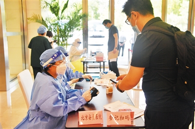 6月25日,北京市第十三次党代会代表报到现场,代表扫码并进行核酸检测。