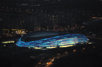 夜幕中的国家速滑馆。国家速滑馆又被称为“冰丝带”,22条丝带就像运动员滑过的痕迹,象征速度和激情。资料图片/李凯祥 摄