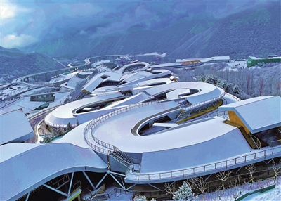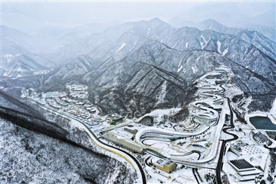 在延庆冬奥村的一侧山脊上,被称为“雪游龙”的国家雪车雪橇中心,矗立在山腰的平台上,从雪车雪橇中心往下,沿着蜿蜒曲折的山脊建成的赛道,宛若一条盘旋在山中的游龙。