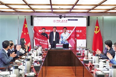 2月21日,中国人民大学党委书记张东刚为新成立的冬奥师生宣讲团授旗。中国人民大学供图