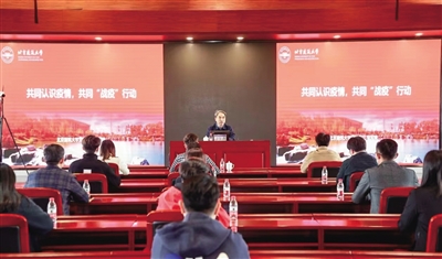 4月29日下午,北京建筑大学党委书记李军锋为全校师生讲授疫情防控思政课。北京建筑大学供图