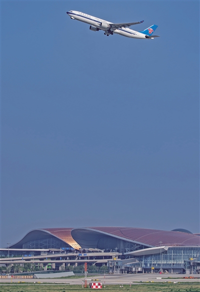 2020年9月2日,北京大兴国际机场,飞机起飞。新京报记者 陶冉 摄