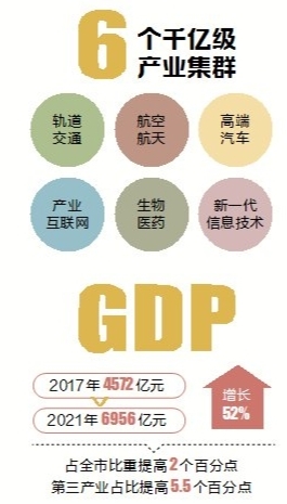 城南地区生产总值(GDP)由2017年的4572亿元增长到2021年的6956亿元,五年来增长52%,占全市比重提高2个百分点,第三产业占比提高5.5个百分点。规模以上工业总产值由5570亿元增长到9063亿元,增长63%,产业结构从一般制造业向高端装备制造和智能制造全面转变。