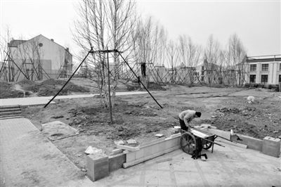 四周的道路也铺好了水泥,几名工作人员正在给小花坛贴瓷砖。一个小公园已初具雏形。