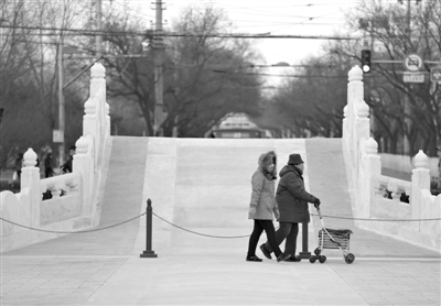 12月17日,几位居民在遛弯。位于前门大街向南的老天桥即将修复完成。新京报记者 韩萌 摄