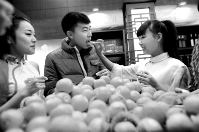 昨日,国家会议中心,一位工作人员请市民品尝来自湖北十堰的橘子,今起,南水北调水源区的绿色农产品将进驻北京超市。为了保护南水北调丹江口水库的水质,湖北十堰关停了500余家工厂。北京市将引进该地区农产品作为对口支援的合作项目之一。即日起,湖北十堰的150余种优质特产将正式进驻京客隆、天虹商场国展店等在京5家商务企业,包括翘嘴鲌鱼、绿松石、武当金银花茶等当地特色农副产品。