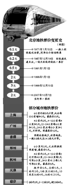 北京2元票价制自2007年实施。2010年初,市政协委员陈杰建议早晚高峰时段地铁单程票价涨至五六元。