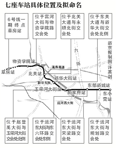 轨道交通6号线二期全线为地下线,线路全长12.395公里,西起6号线一期终点草房站,东止通州区东小营。目前草房站已随一期命名,6号线二期尚未命名的车站为7座。