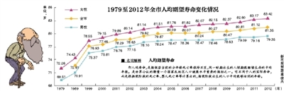 北京市最早有据可查的人口平均期望寿命是1979年,当年全市女性人均期望寿命为72.26岁,男性仅为69.51岁,均比目前低10岁左右。20年后即1999年,北京市人均期望寿命增长至76.93岁。