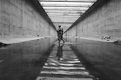 6月27日,一位工人正在清理刁河渡槽内的施工垃圾,整个渡槽宽约13米,高约8米。