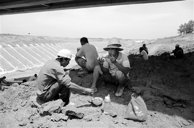 6月27日,工人们坐在水渠的顶部吃午饭。他们身后是已经完成的渠道。