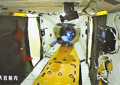 在张晓光的协助下,聂海胜顺利开启天宫一号舱门,随后,3名航天员依次进入天宫一号,通过安装在舱内的摄像机镜头向地面科研人员挥手致意。