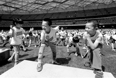 “阳光鸟巢”小朋友们一起在做热身操。昨日,近四千名3至12岁的小朋友和家长在国家体育场参加“阳光鸟巢”活动,以运动的方式度过六一儿童节。新京报记者 吴江 王卡拉 摄影报道