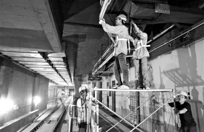 昨日,昌八联络线平西府站,工作人员在站台施工。昌平线和8号线联络线工程预计今年年底试运营。新京报记者 薛珺 摄
