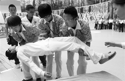 园博园内,一位观众突然“晕倒”,志愿者将其扶起。昨日,北京市相关部门和区县就园博会、地铁、危险化学品等领域潜在的突发事件开展应急演练。 新京报记者 韩萌 摄