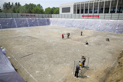 昨日,中关村展示中心雨洪利用示范工程正在施工,其容积7000立方米,控制流域面积29公顷。新京报记者 侯少卿 摄