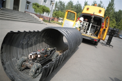昨日,辛店路,排水集团工作人员正在展示管道监测机器车。新京报记者 侯少卿 摄