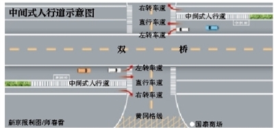 新京报讯 (记者郭超)地铁6号线开通后,连接京通快速路和朝阳北路的南北通道常拥堵不堪,双桥作为交通节点车流和行人交叉混行严重。近日,北京市交管局在该地区首次试用中间式人行道。