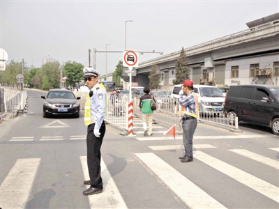 ◀昨日,双桥路口,交警在指挥车辆通行。新京报记者 郭超 摄
