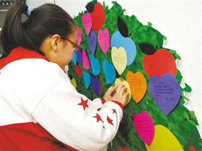 参观展览的学生将写有“践行雷锋精神承诺书”的爱心卡贴在“雷锋精神践行树”上。新京报记者 李禹潼 摄
