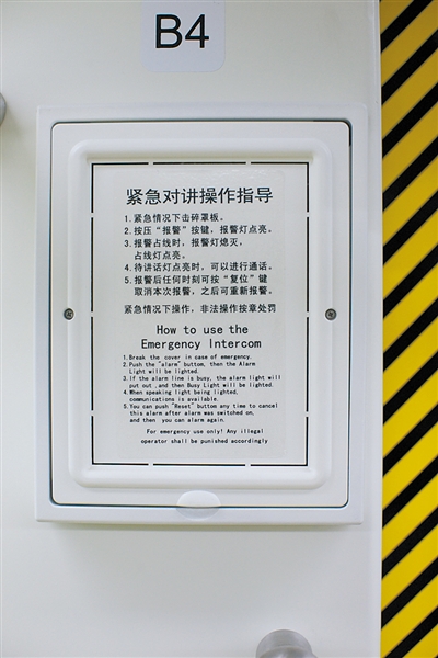14号线车厢内则公布了“紧急对讲操作指导”,共有5个步骤,紧急情况下击碎罩板;按压“报警”按键,报警灯点亮;报警占线时,报警灯熄灭,占线灯点亮;待讲话灯点亮时,可以进行通话;报警后任何时刻可按“复位”键取消本次报警,之后可重新报警。不过,该操作只限紧急情况下,非法操作将按章处罚。