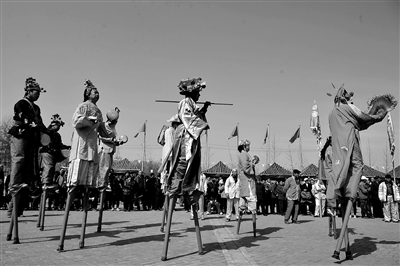 昨日,长子营镇高跷老会的演员们在表演高跷。当日,大兴区长子营镇文化旅游季启动,在为期三天的活动中,当地村民不但进行各种花会表演,还将向游客展示非遗白庙音乐、五音大鼓等。旅游季期间,地方特色小吃油糕、饹馇盒、灌肠、山楂糕等也将向游客供应。新京报记者 吴江 杜丁 摄影报道