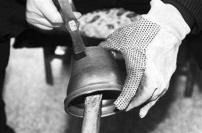 景泰蓝的制作材料是紫铜板。按照图纸,将材质合格的紫铜板裁剪为不同的扇面或圆形,用铁锤将其打制成瓶、盘、碗、罐等各种形状的铜胎。北京市珐琅厂供图
