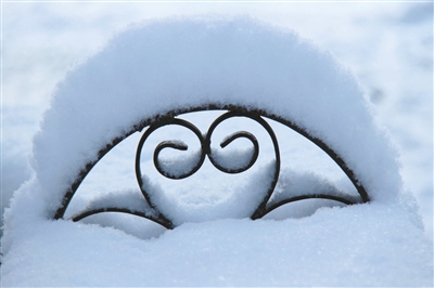 日坛公园,长椅的扶手埋在雪中,好似孙悟空的金箍。