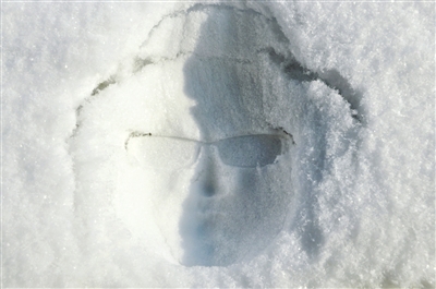 景山公园,一名女游客将脸印在积雪上。
