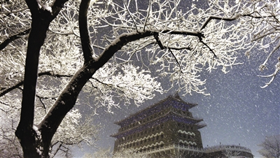 昨日凌晨2时许,前门,大雪在灯光下纷纷扬扬。
